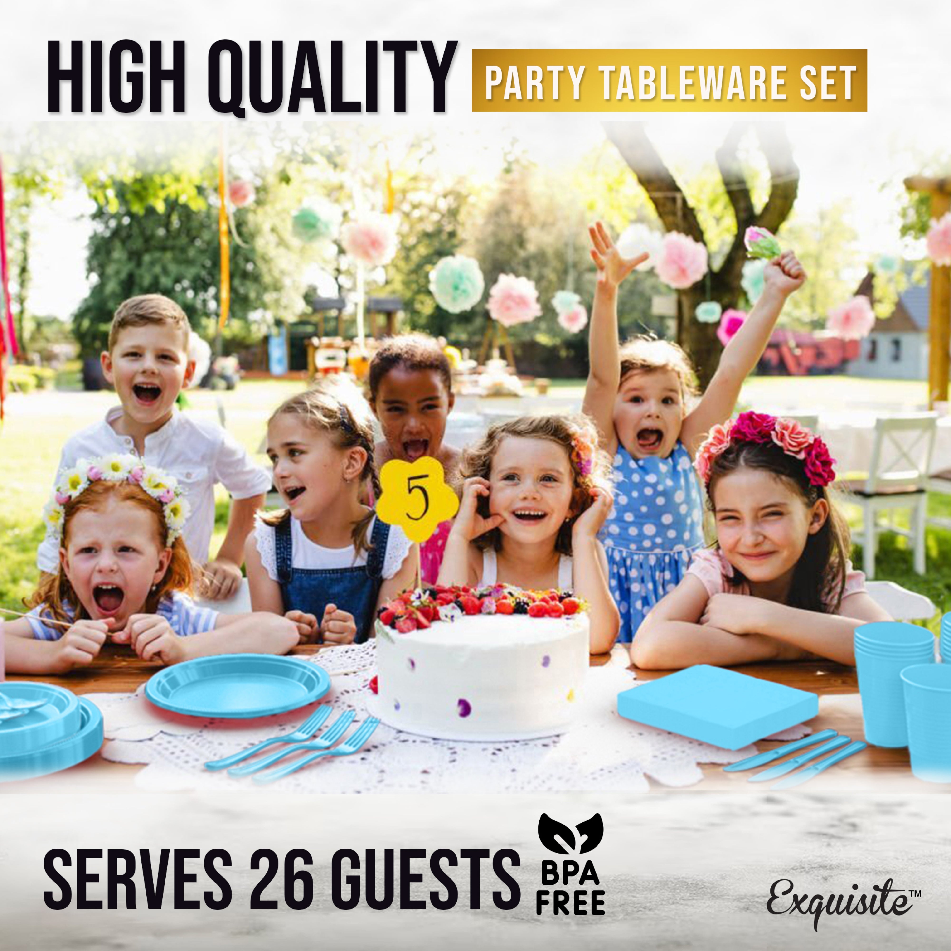 Complete light blue party tableware set for 26 guests! Includes plates, cups, napkins & more. Perfect for birthdays, showers & celebrations.
