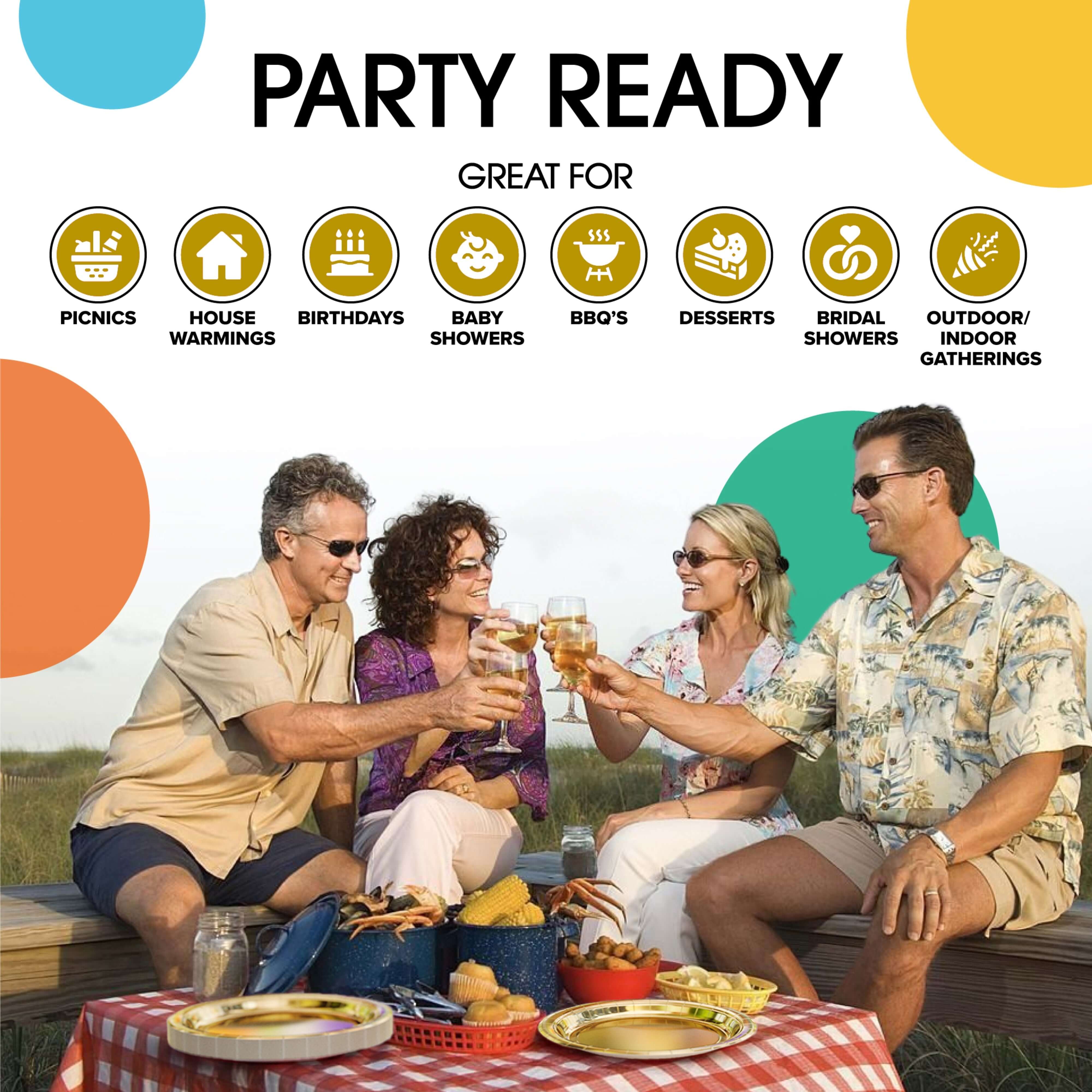 Indulge in luxury and elevate your dining experience with our 9 In. Reflective Gold Paper Plates. Each pack includes 50 plates, perfect for any gathering. The reflective gold design adds a touch of elegance to your table setting, while the sturdy paper material ensures convenience and easy cleanup.