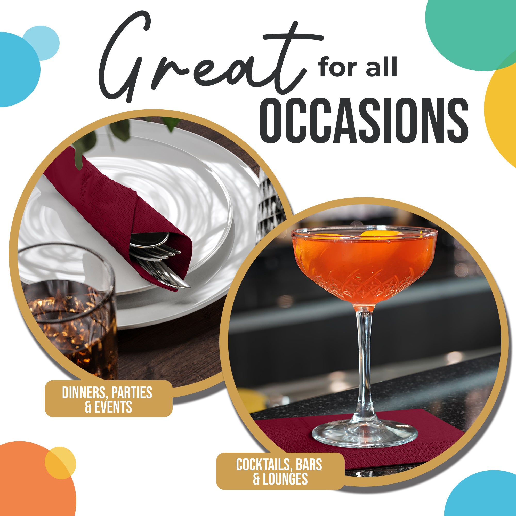 Elevate your gatherings with these sophisticated burgundy beverage napkins. Perfect for cocktail hours, dinner parties, and casual celebrations, this 100-count pack ensures you're always prepared for guests. The rich burgundy hue adds an elegant touch to any table setting while maintaining practical absorbency for everyday use. Whether you're hosting an intimate dinner or a larger event, these versatile napkins deliver both style and functionality. Stock up and make cleanup effortless while impressing your guests with thoughtful details that matter.