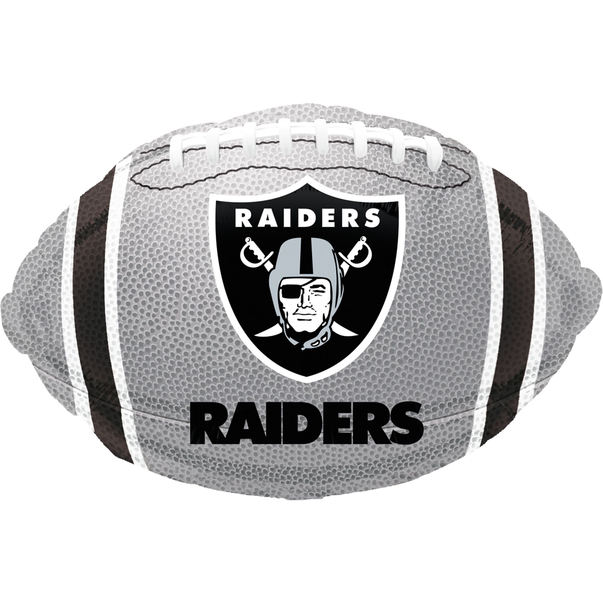Celebrate your team spirit with this 18-inch Raiders Football Foil Balloon. Perfect for game day festivities or sports-themed events, this metallic balloon features the iconic Raiders emblem on a realistic football design. Add it to your party decorations or gift it to a fan for an unforgettable touch. Durable and eye-catching, it's the ideal addition for any Raiders supporter.