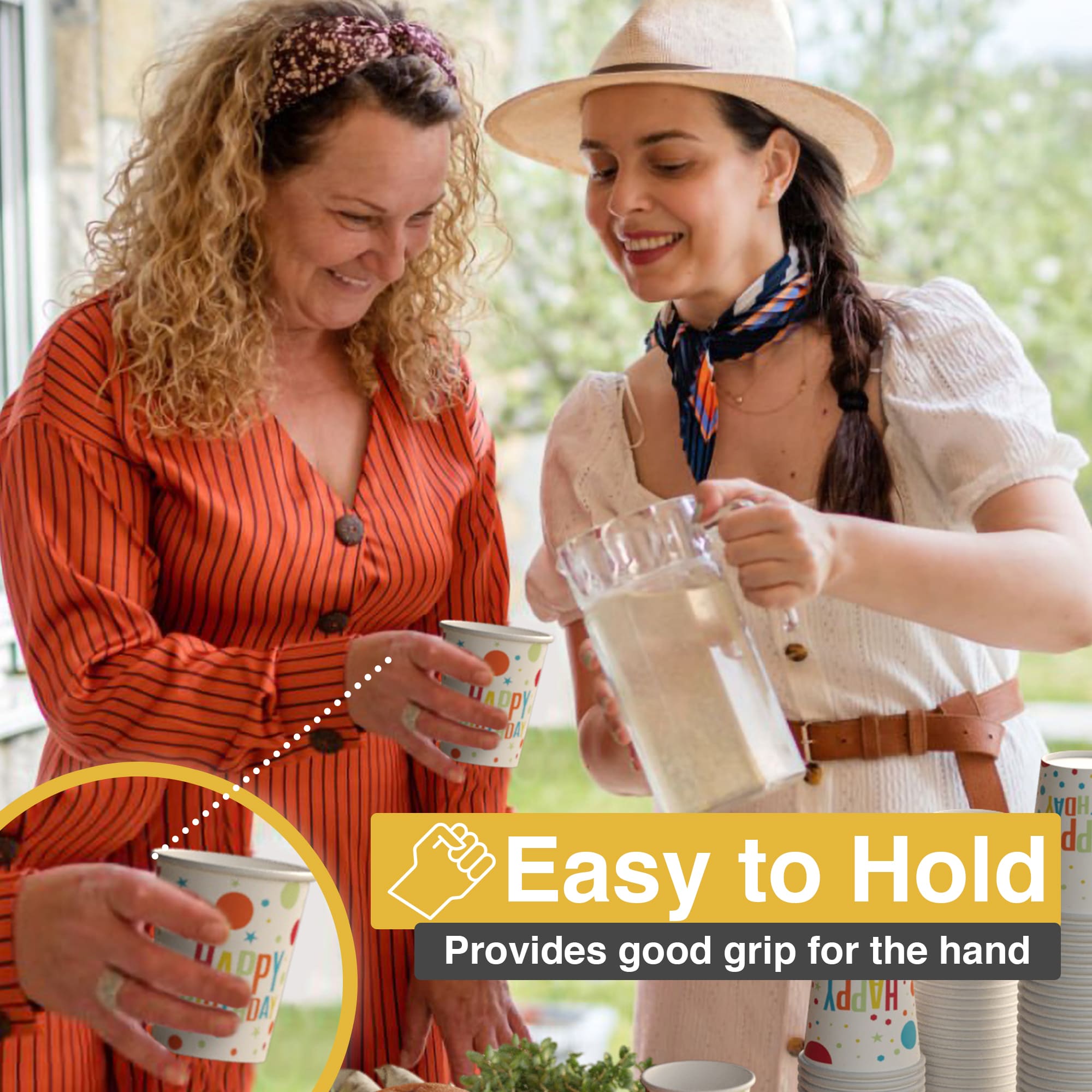Elevate your birthday party with our 9 oz. Birthday Print Paper Cups. Each pack includes 50 cups, perfect for all your guests. Say goodbye to spills and hello to effortless elegance. Start the celebration off right with these premium cups.