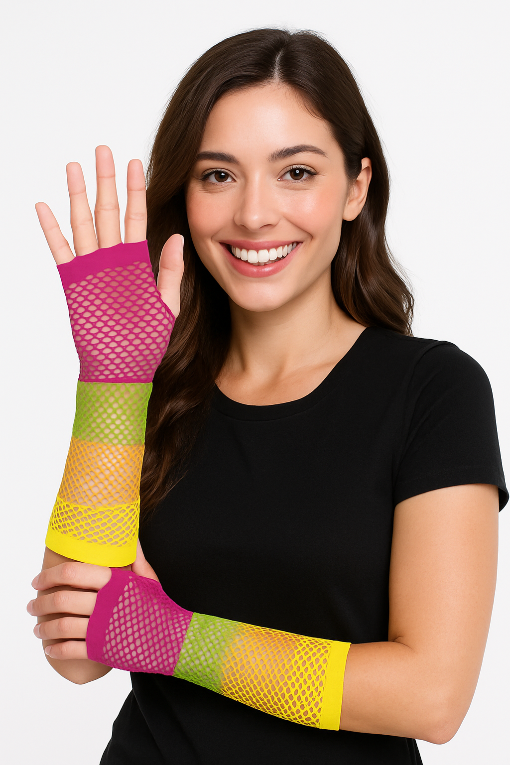 Amp up your style with these vibrant Neon Long Fishnet Fingerless Gloves. Perfect for any 80s punk look or team spirit event, these gloves stretch to the elbow and feature a fun, colorful design. Crafted from durable polyester with heavy elastic bands, they ensure a snug fit. Ideal for costumes or everyday flair, these gloves are a must-have accessory for standing out in the crowd.