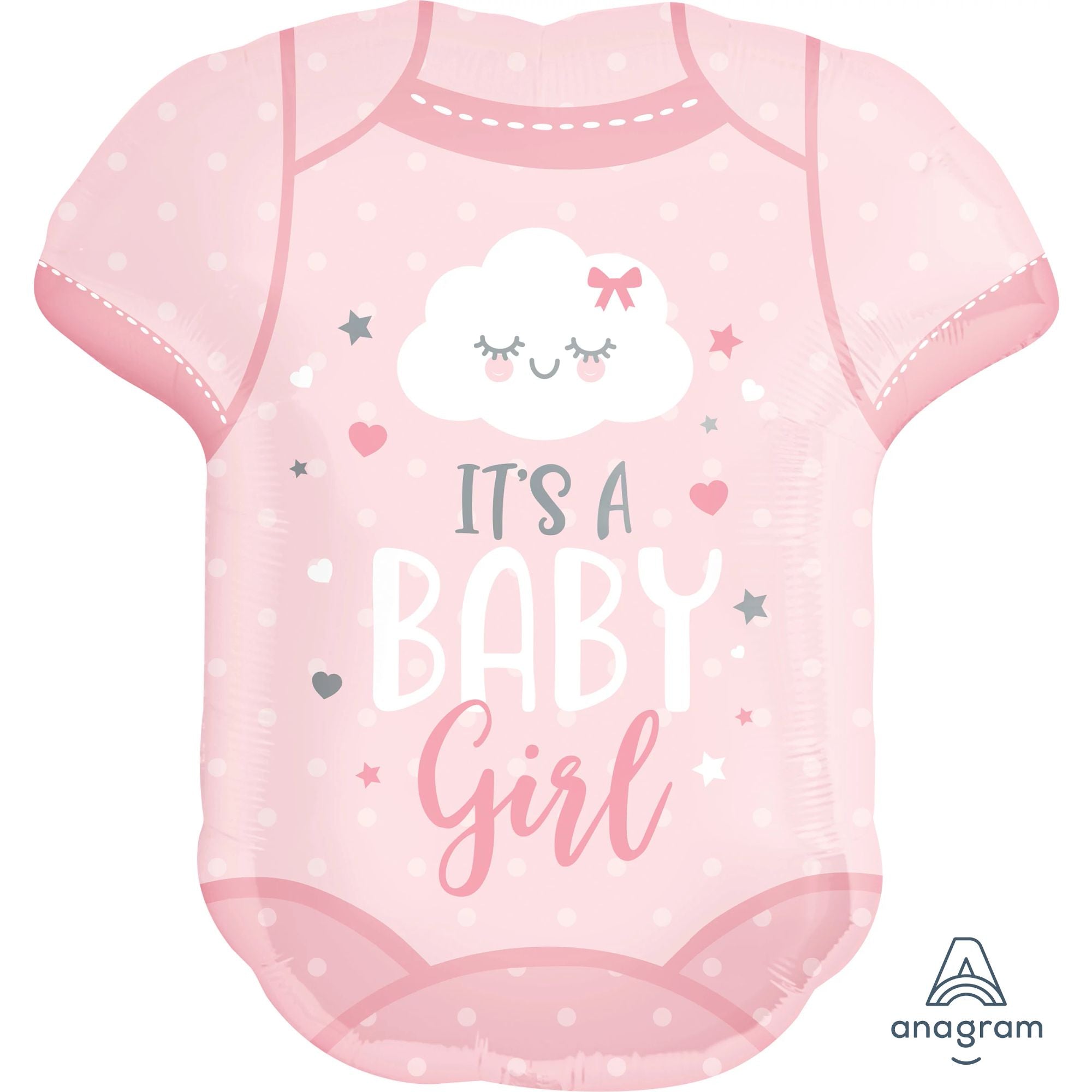 Celebrate her arrival in style with this Baby Girl Onesie Super Shape Foil Balloon. Perfect for juvenile birthdays and everyday celebrations, this adorable metallic balloon features a charming cloud design and the cheerful message "It's a Baby Girl." Make your event unforgettable with this delightful and eye-catching Mylar balloon. Ideal for welcoming parties or gender reveal events, it's a sweet addition to any festive occasion.