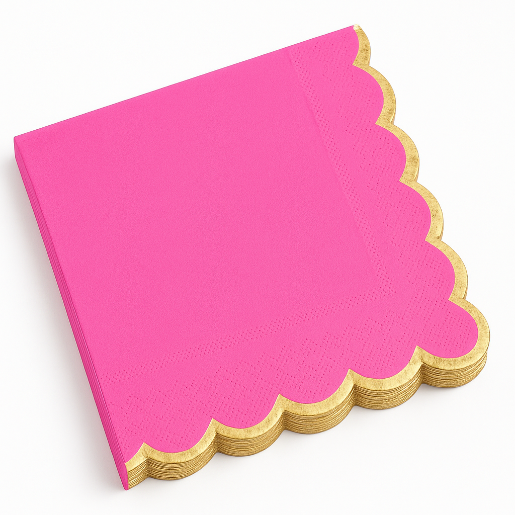 Add a pop of color and elegance to your table setting with these Bright Pink Luncheon Napkins. Featuring a chic scalloped edge and a luxurious gold hot stamp, these napkins are perfect for any occasion. Crafted from quality materials, they are both stylish and practical, making them an ideal choice for everyday use or special events. Elevate your dining experience with these eye-catching napkins today!