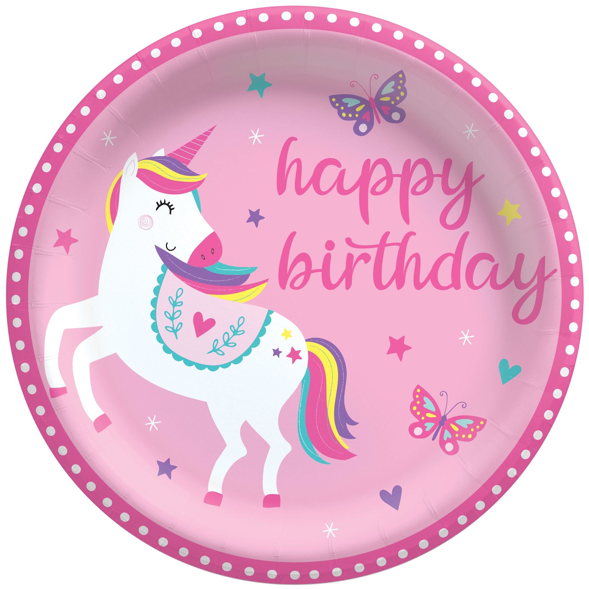 Make your child's birthday magical with our Enchanting Unicorn Birthday Plates. These 8.5" round paper plates feature a delightful unicorn design, set against a soft pink background, perfect for sparking joy and wonder. Ideal for everyday celebrations, these plates add a whimsical touch to any juvenile birthday party. Coordinate with other printed ensembles for a complete party theme!