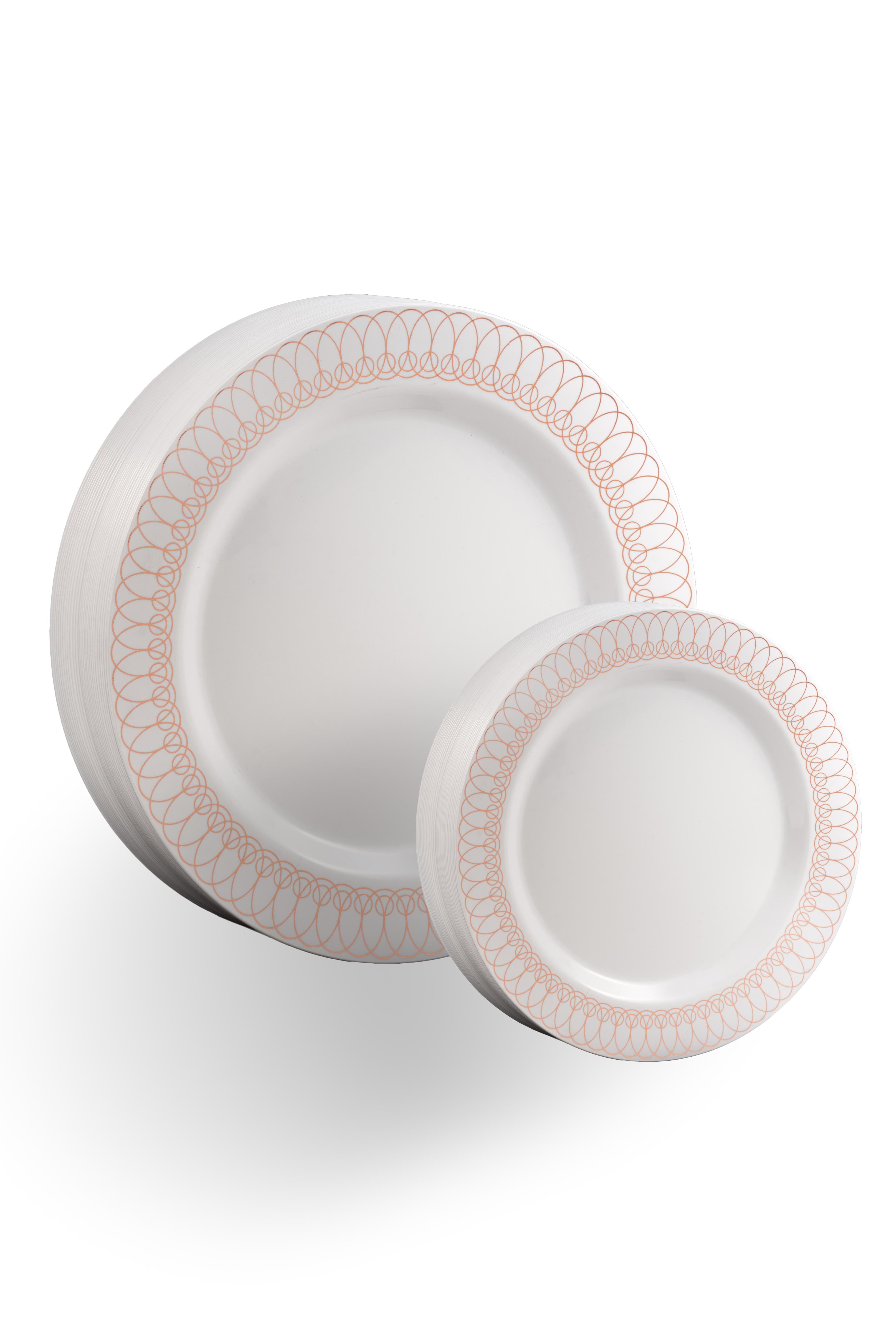 These Fancy Disposable Dinner Plates Feature A White Base With Rose Gold Trimming. Designed To Look Like Real China While Priced So That They Can Be Used As A Disposable, This Elegant Set Is A Must-Have For Any Formal Affair. Each Disposable Dinnerware Set Contains 30 Large (10.25 Inch) Plastic Dinner Plates And 30 Small (7.5 Inch) Plastic Salad/Dessert Plates. Perfect For Weddings, Dinners, Or Any Upscale Party; Our Heavy Duty Plastic Plates Are Also Reusable - Just Clean And Reuse At Your Next Event!