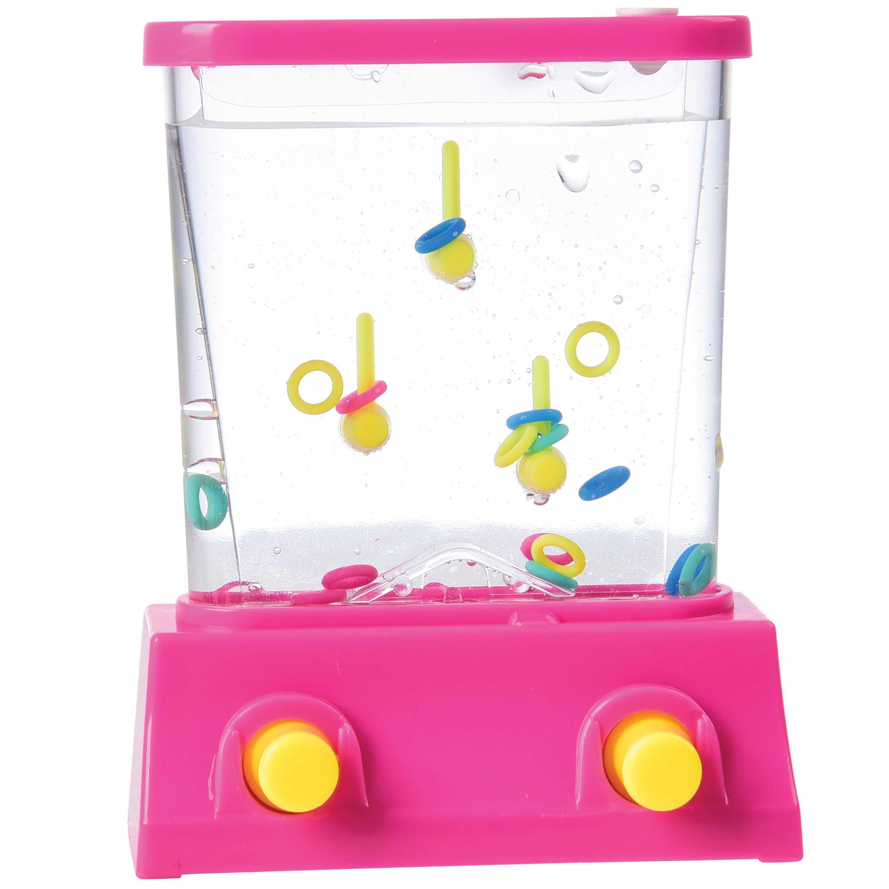 Classic water ring toss game in pink! Fill with water and press buttons to shoot rings onto pegs. Perfect retro party favor that keeps kids entertained.