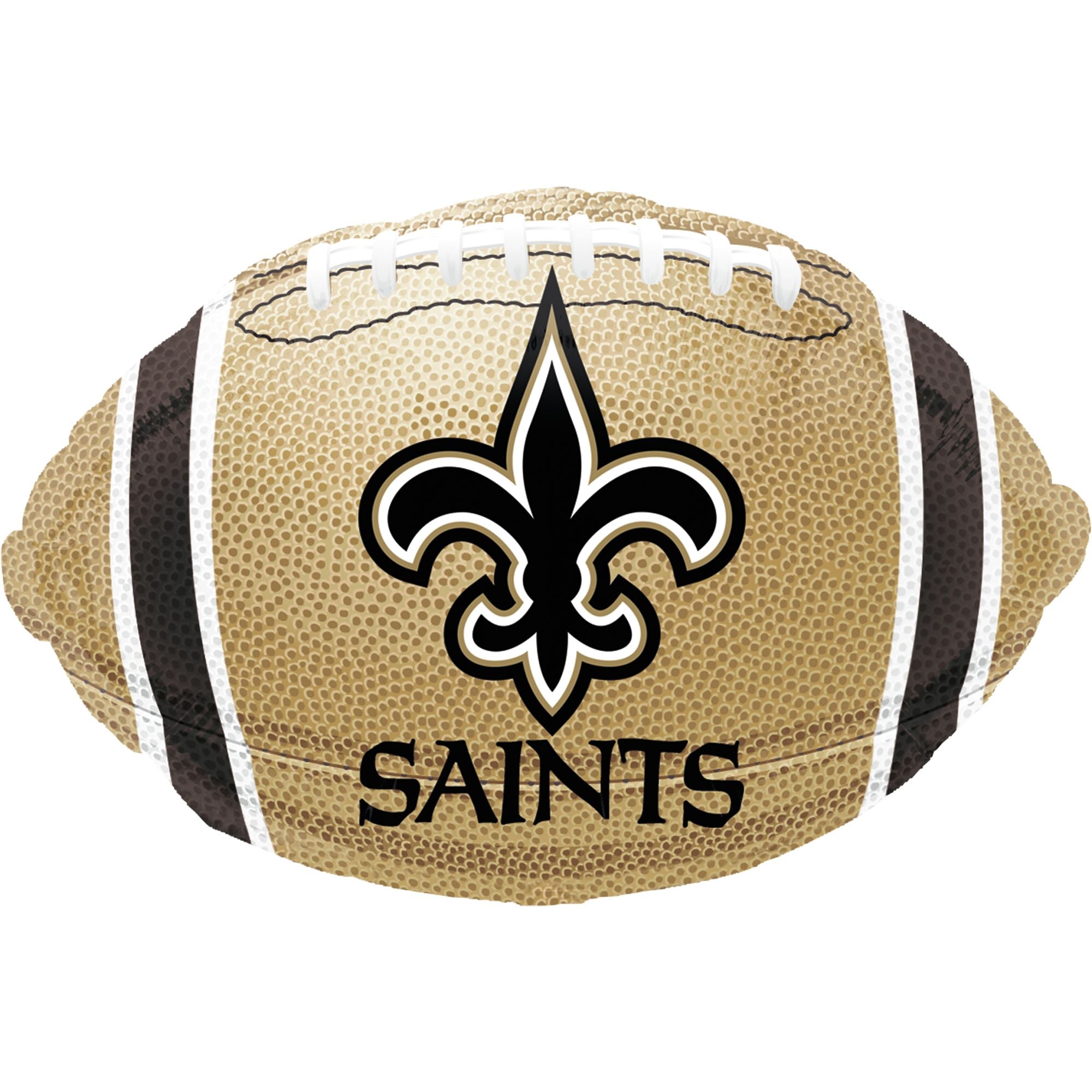 Cheer on the New Orleans Saints with this 18-inch Football Shaped Balloon! Featuring the iconic Saints logo in the center, this gold balloon with black and white detailing is perfect for any fan. Made from durable foil, it’s self-sealing and reusable. Ideal for tailgate and football parties, pair it with other balloons to create a festive bouquet. Includes helium inflation and ribbon. Officially licensed NFL product. Note: Balloon ships uninflated; inflate with receipt at the store. Dimensions: 17" x 12".