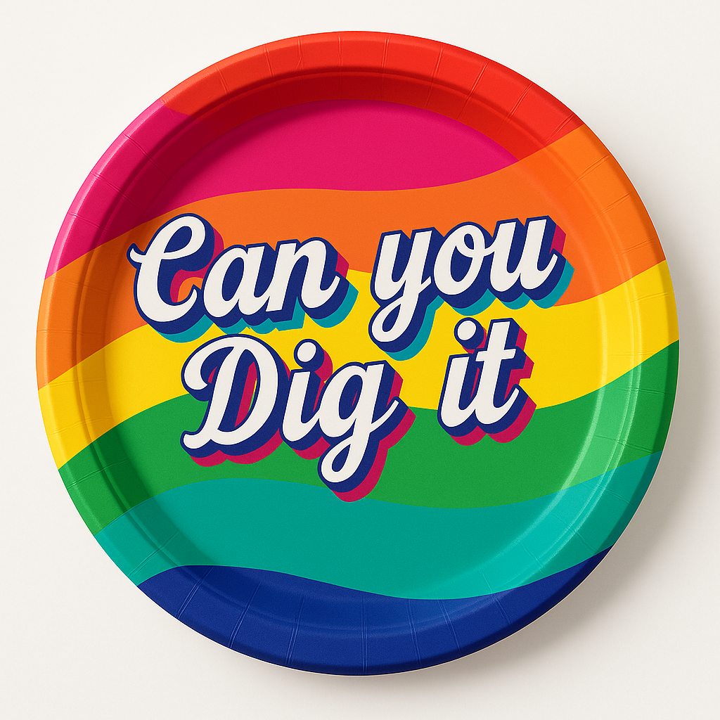 Bring the spirit of the '70s to your table with these vibrant 7" Good Vibes Dessert Plates. Featuring a retro "Can You Dig It" design on a colorful, wavy background, they're perfect for your '70s-themed party or disco event. Made from durable paper, these plates are ideal for holding appetizers and desserts. Each set includes 8 plates, ensuring your gathering is both stylish and convenient.