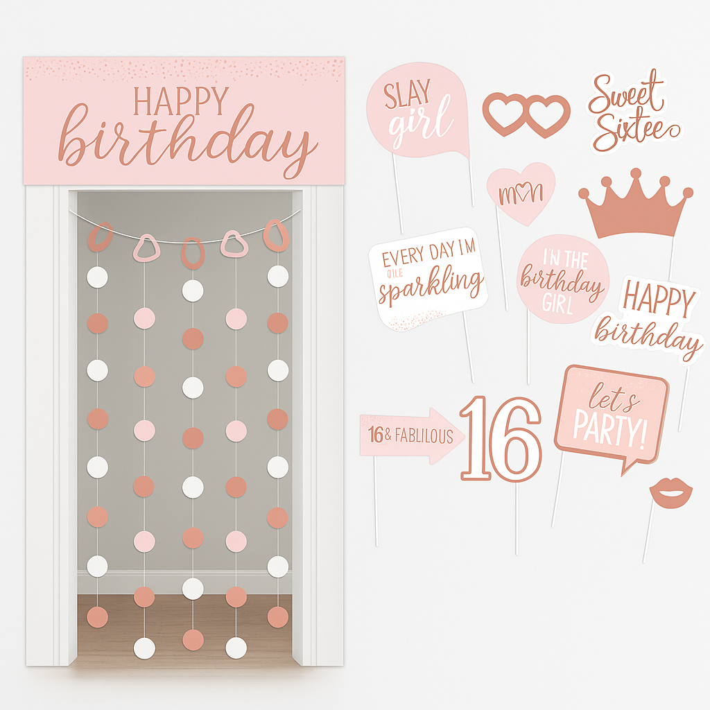 Celebrate a milestone in style with the Sweet 16 Glitter Gold and Pink Photo Booth Kit. This charming set features a "Happy Birthday" backdrop with stylish circular cutouts, perfect for setting a festive scene. The kit includes 13 fun photo props, such as tiaras, heart-shaped glasses, and playful signs, all in a chic palette of metallic gold, pink, and black. Capture unforgettable memories at the party and make every selfie special. Backdrop dimensions are 39" W x 77" L (99 x 195.5 cm). Let the fun begin with this 14-piece kit!