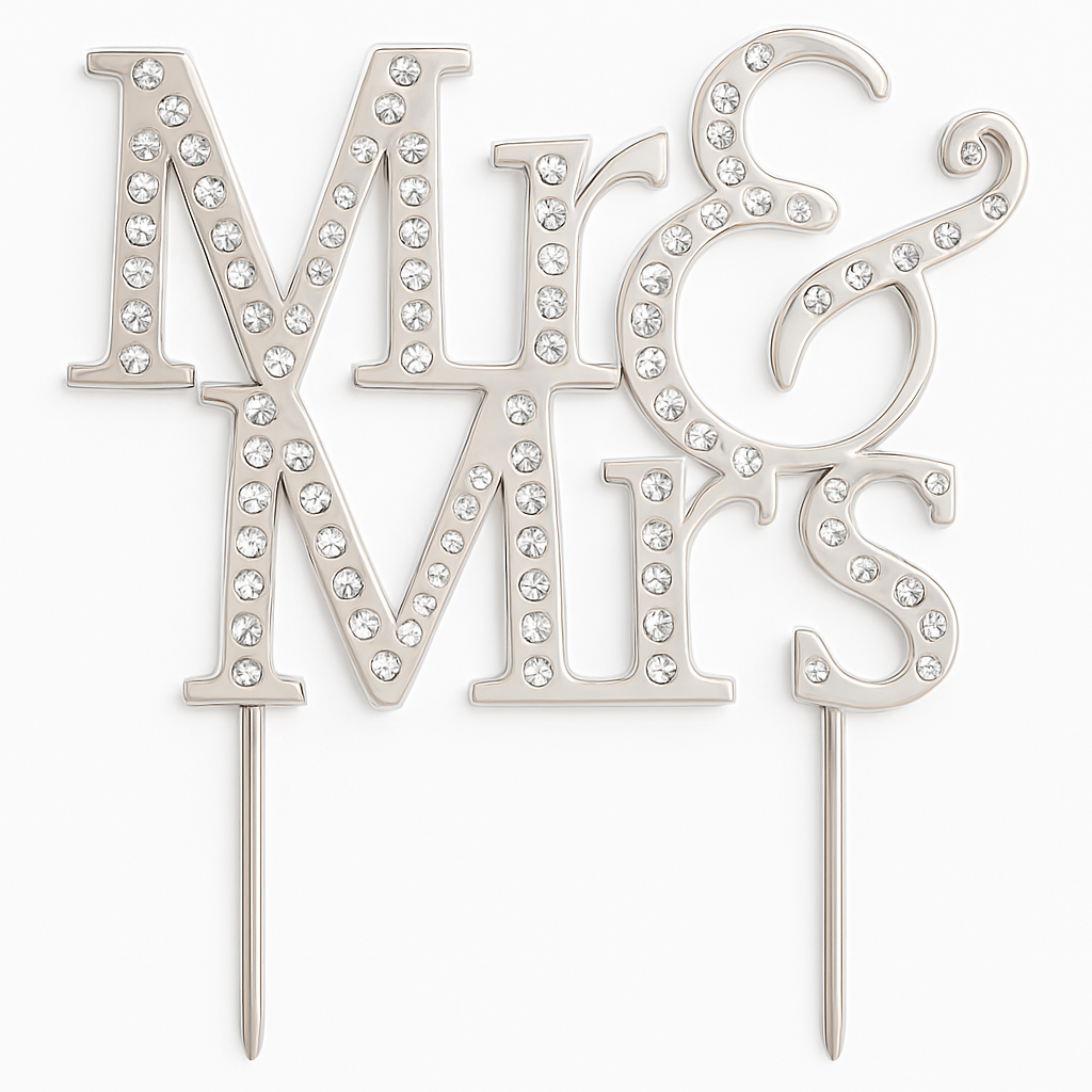Elevate your wedding cake with our stunning "Mr & Mrs" Rhinestone Cake Topper. Crafted from eye-catching metallic silver and adorned with sparkling rhinestones, this elegant accessory adds a touch of glam to your special day. Designed with two sturdy picks for easy placement, it stands securely on cakes of all sizes. Measuring 5 1/4" wide by 5" tall, it's the perfect centerpiece for weddings, engagements, or anniversaries. Celebrate your love in style with this exquisite cake topper!