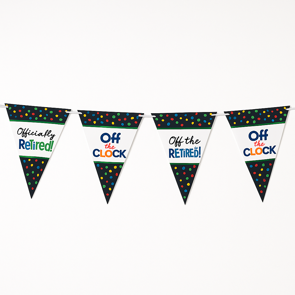 Celebrate the milestone of retirement with our vibrant "Off The Clock" Pennant Banner! Featuring colorful dots that pop against a sleek black background, this double-sided banner declares "Officially Retired!" and "Off the Clock!" with style. Measuring 15 feet wide, it includes 24 festive flags and a white satin ribbon for easy assembly. Perfect for adding a joyful touch to any retirement party, it's the ultimate decorative statement. Simple assembly required.