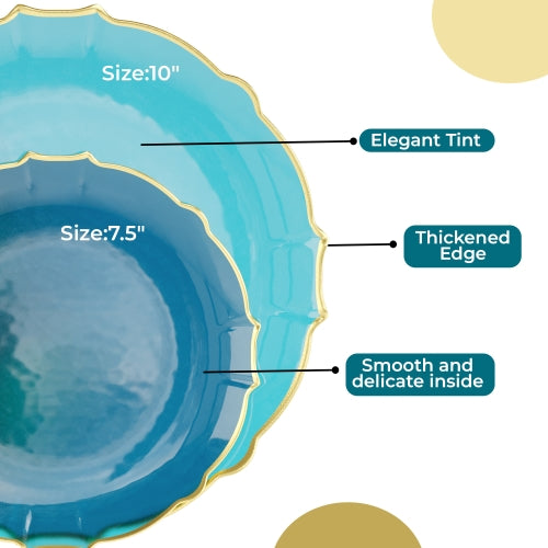 Our turquoise/gold petal plastic plates are designed for single-use, ensuring a hassle-free experience. Once your event is over, simply dispose of the plates without the worry of washing and storing them. Our elegant collection of disposable plastic plates is the ultimate choice for those who appreciate an elegant yet quick setup. An excellent choice for those looking to demonstrate that disposables can also exude elegance. Whether you're hosting a formal dinner or a casual get-together, these plates are the perfect addition to your table.