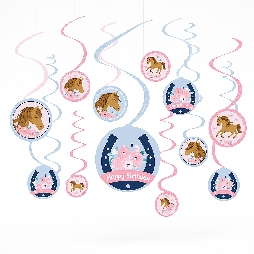 Create a whimsical Western birthday scene with these Saddle Up Swirl Decorations. Perfect for your child's birthday celebration, each pack includes 12 durable paper swirls in delightful pink and blue hues. Featuring charming horses, horseshoes, and "Happy Birthday" banners adorned with pink bouquets, these decorations add a festive touch to any party space. Ideal for transforming your party into a joyful rodeo for all to enjoy!
