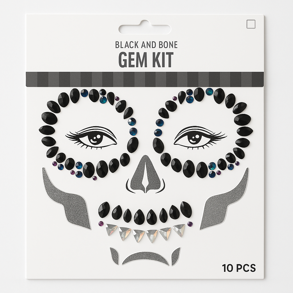 Elevate your Halloween costume with this Skeleton Face Gem Kit. Featuring black and clear rhinestones in striking round, triangular, and teardrop shapes, these self-adhesive gems make it easy to achieve a dazzling skeletal look. With 10 glittery stickers, you can create a bone-chilling appearance effortlessly. Perfect for adding an eerie sparkle to your Halloween festivities.