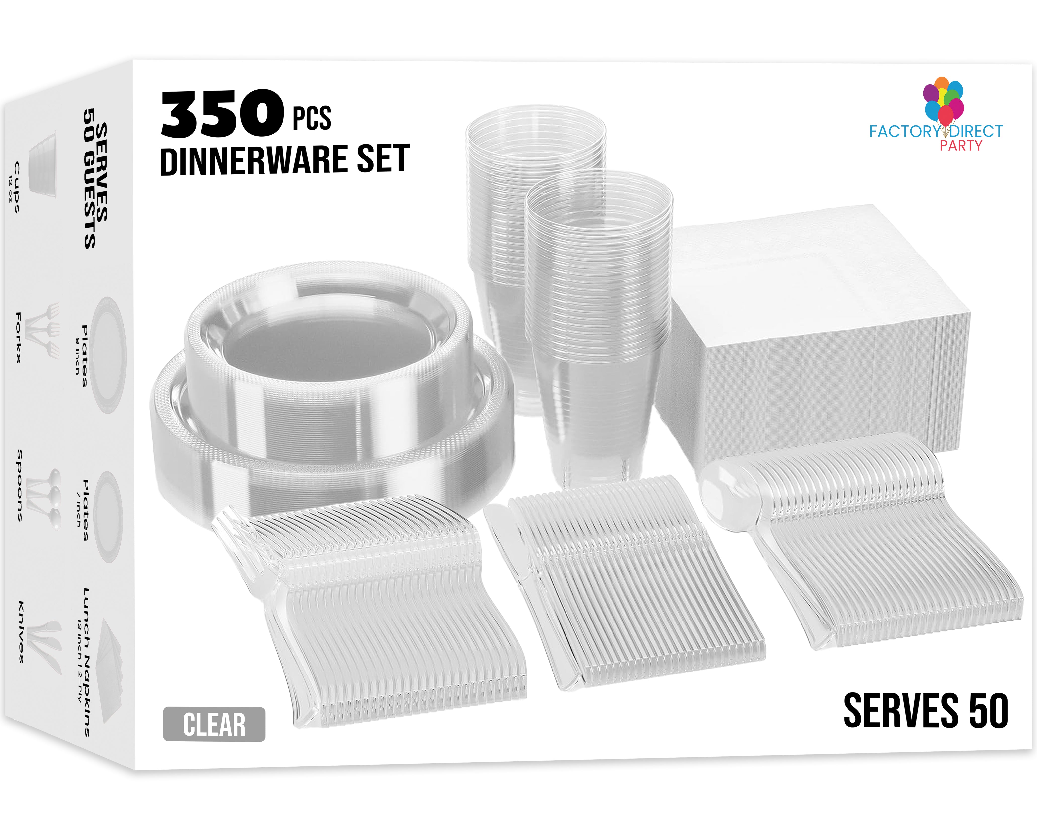 Each plastic combo set comes with 9 and 7 plates, cups, napkins, forks, spoons, and knives.