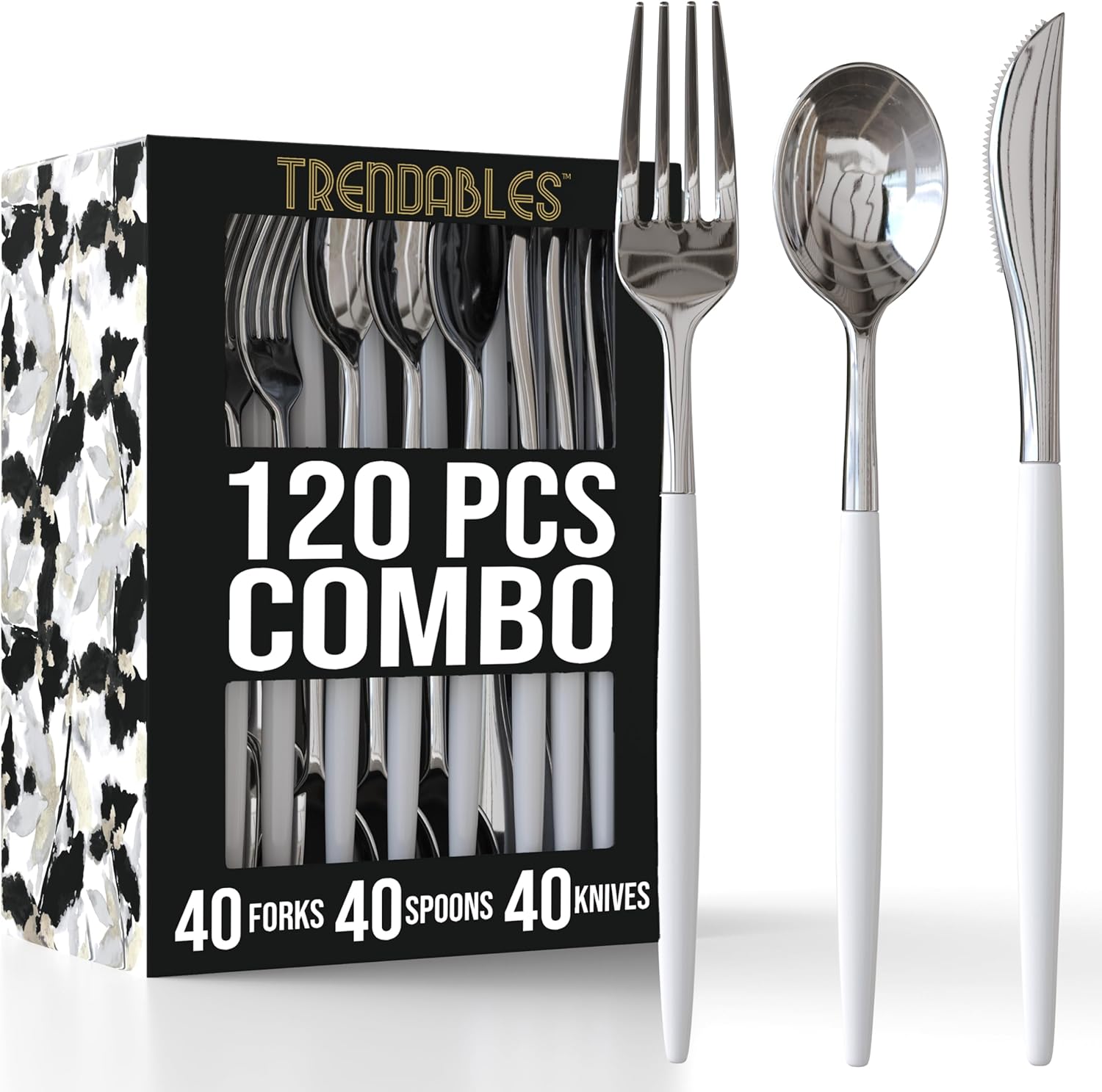 This pack contains 120 metallic silver/white plastic cutlery pieces, including knives, forks, and spoons, 40 each. Made with high-quality, BPA-free plastic, this cutlery is not only sturdy, but also adds a touch of luxury to your table, looking just like real metal cutlery. Their shiny metallic finish will elevate any table setting, making them perfect for weddings, fancy dinner parties, and anniversaries.