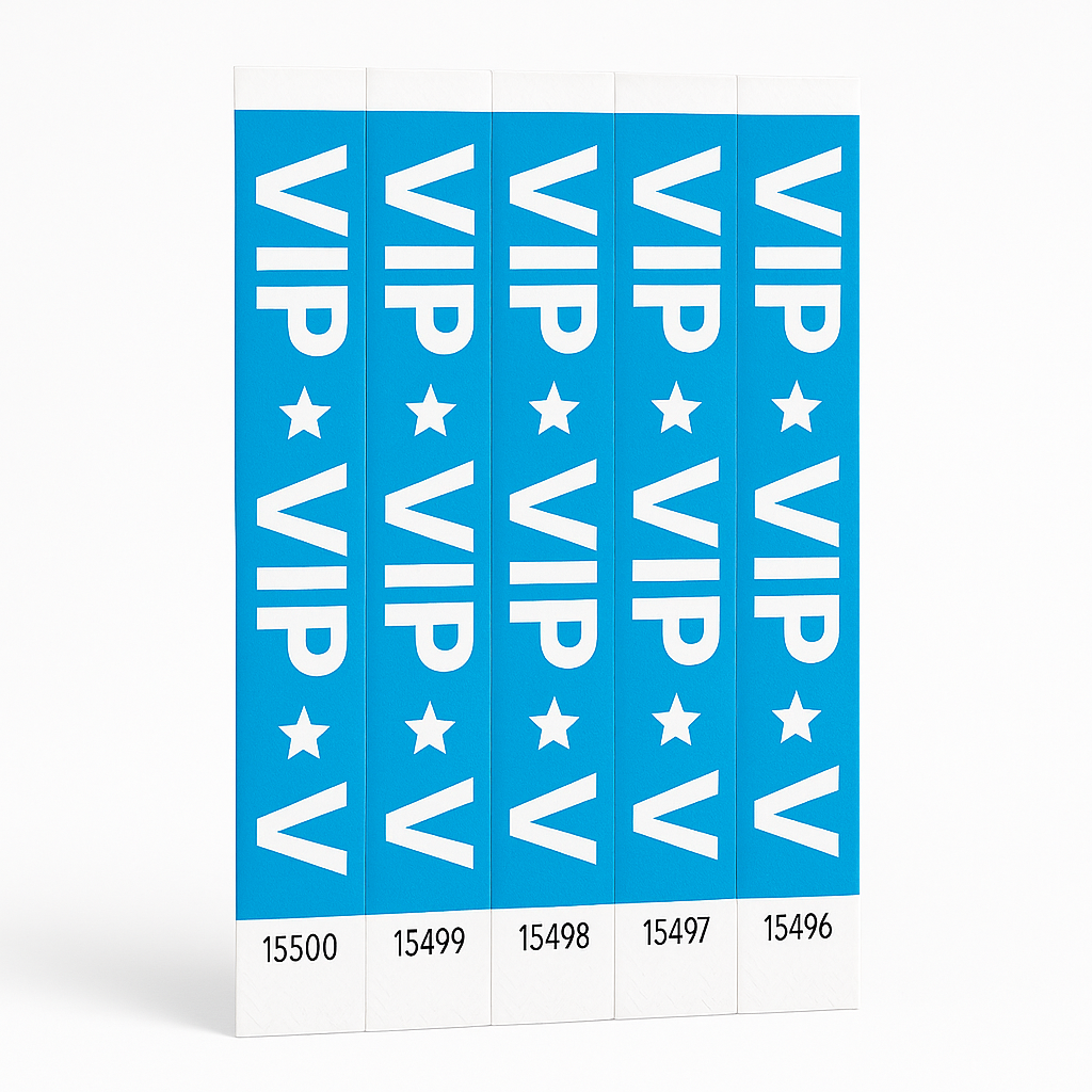 Ensure seamless event management with these VIP Star Blue Waterproof Wristbands. Perfect for any occasion, these durable plastic bands come in a pack of 500 and feature consecutive numbering for easy tracking. Ideal for color-coding access, monitoring guest flow, or designating VIP areas, these wristbands are essential for any large gathering or event. Keep your attendees organized and the event running smoothly with these reliable accessories.