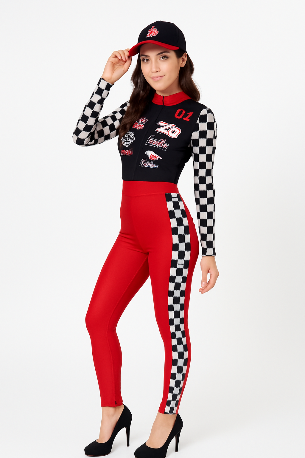Get ready to rev up the fun this Halloween with our Women's Race Car Driver Costume. This exhilarating three-piece ensemble includes a cropped zipper front jacket adorned with authentic-looking printed patches, giving you the full-throttle racer vibe. The outfit features checkered mesh long sleeves and sleek red leggings with striking checkered mesh side panels for a high-speed look. Top it off with the cap featuring a printed logo to complete your transformation into a racing superstar. Available in various sizes, this costume promises a winning finish at any event.